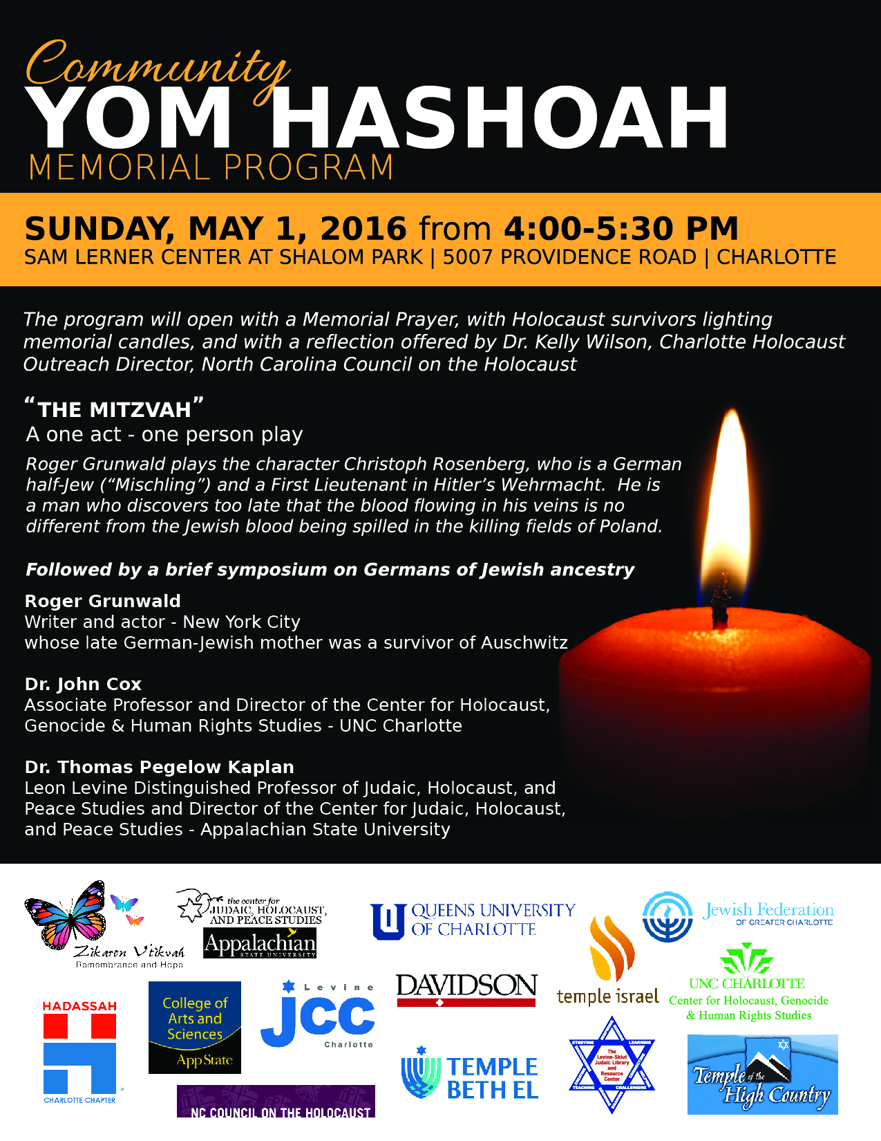 The program will open with a Memorial Prayer, with Holocaust survivors lighting memorial candles, and with a reflection offered by Dr. Kelly Wilson, Charlotte Holocaust Outreach Director, North Carolina Council on the Holocaust
