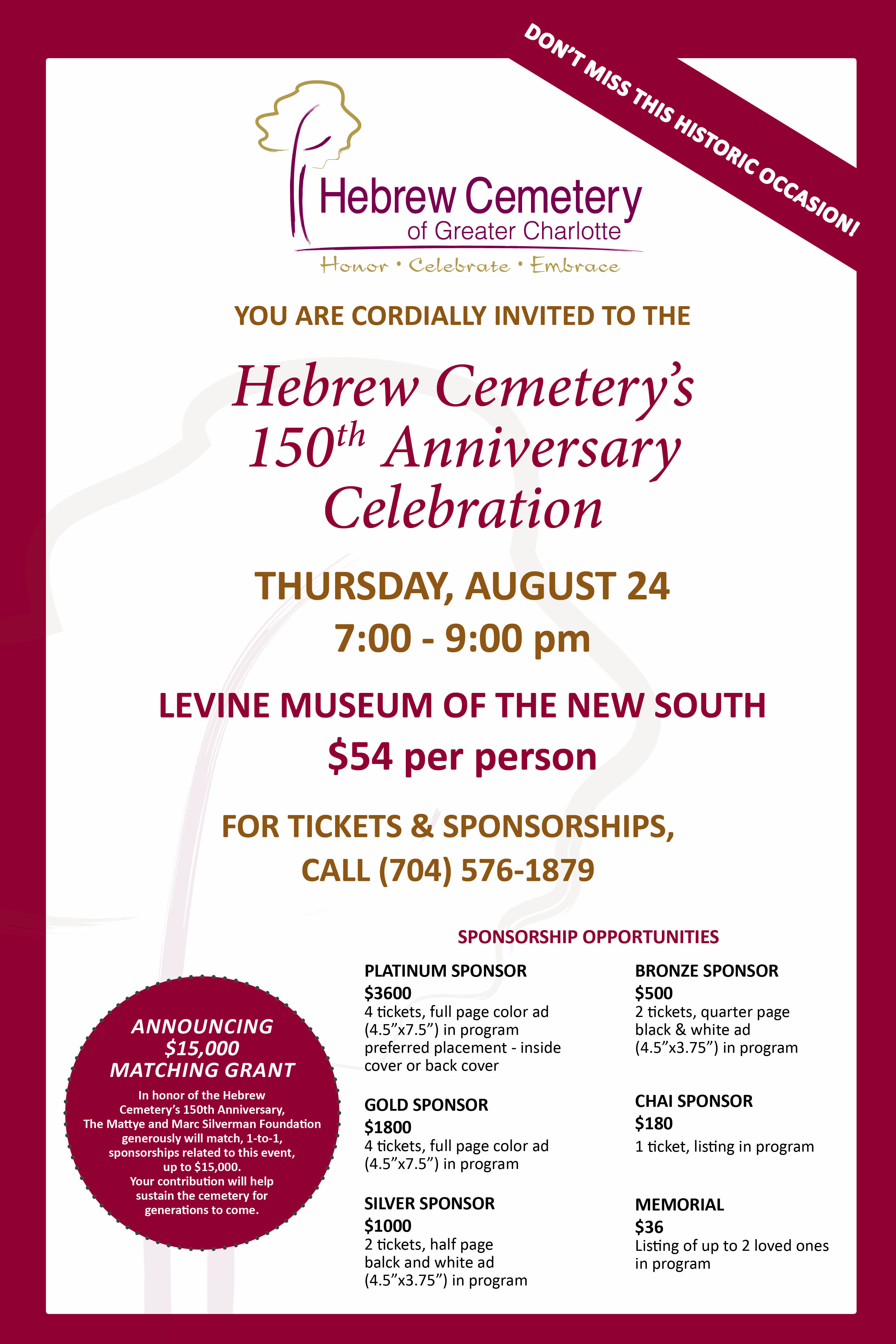 The Hebrew Cemetery is celebrating its 150th anniversary. The cemetery will be celebrating at the Levine Museum of the New South. There will be a new video presentation, speakers, new announcements, heavy hors d'oeuvres and some music.