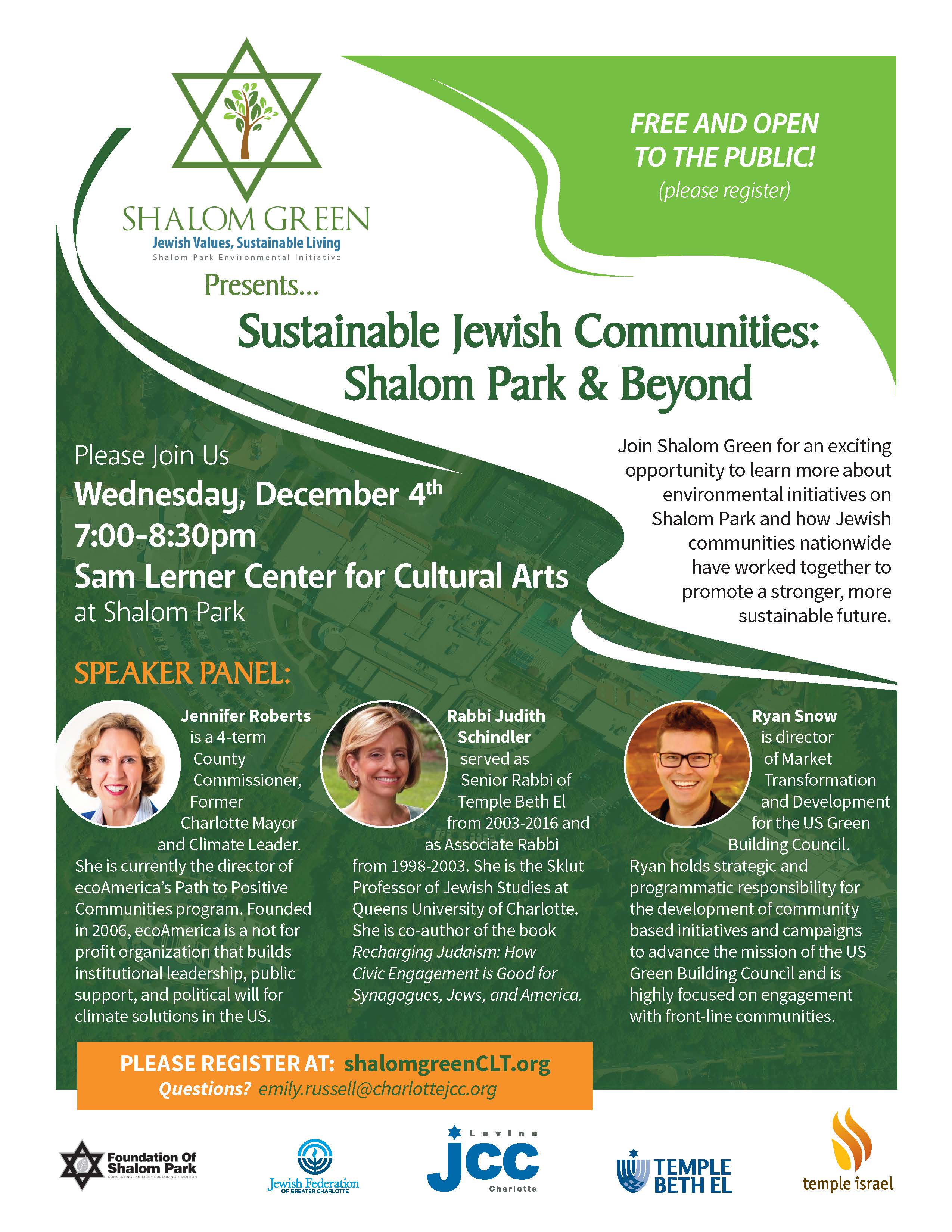 Shomrei Adamah, the concept that we are responsible for the protection and renewal of the earth, is central to Jewish values. Join Shalom Green in welcoming guest speakers Jennifer Roberts, Rabbi Judith Schindler, and Ryan Snow for an exciting opportunity to learn more about environmental initiatives on Shalom Park and how Jewish communities nationwide have worked together to promote a stronger, more sustainable future.