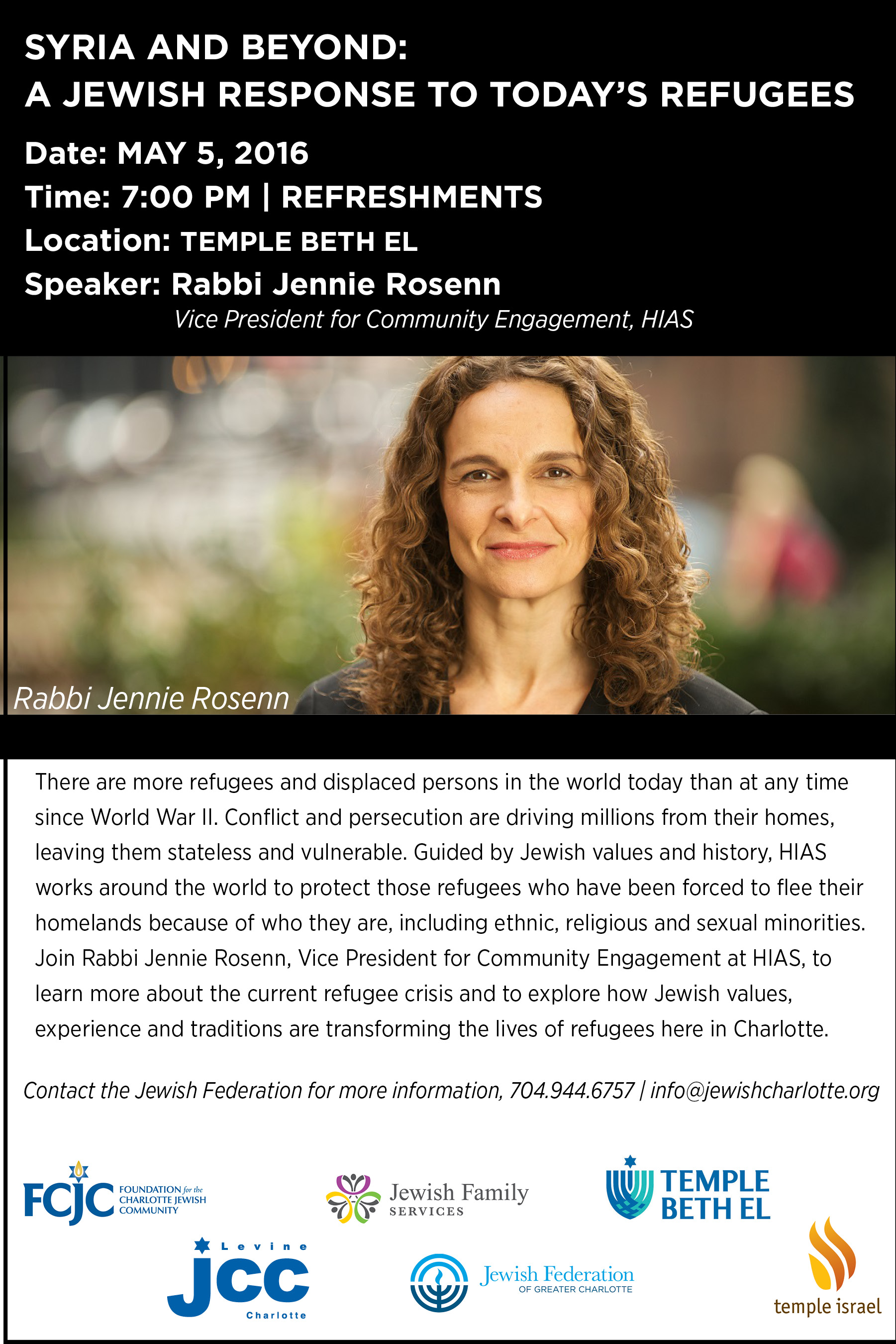 There are more refugees and displaced persons in the world today than at any time since World War II. Conflict and persecution are driving millions from their homes, leaving them stateless and vulnerable. Guided by Jewish values and history, HIAS works around the world to protect those refugees who have been forced to flee their homelands because of who they are, including ethnic, religious and sexual minorities. Join Rabbi Jennie Rosenn, Vice President for Community Engagement at HIAS, to learn more about the current refugee crisis and to explore how Jewish values, experience and traditions are transforming the lives of refugees here in Charlotte.