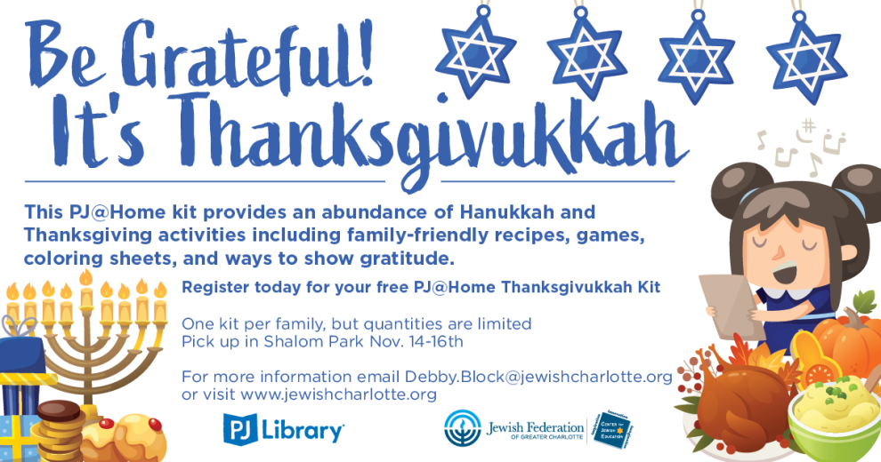 This PJ@Home kit provides an abundance of Hanukkah and Thanksgiving activities, including family-friendly recipes, games, coloring sheets, and ways to show gratitude.